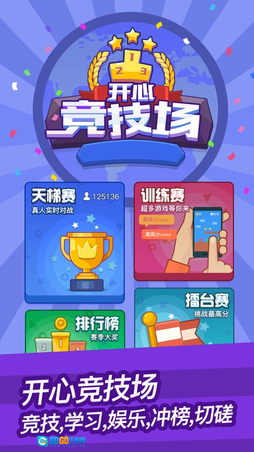 随时随地都能想玩就玩,几分钟一局轻松无负担,实时反馈你的排名,和网友在线比拼,宛如“头脑王者”一样的答题机制,考验着你的脑容量,还有各种各样的单机小游戏,消磨你的无聊时光,还收集了众多有趣好玩的休闲游戏,可以自己玩,可以对战,可以打擂台,还可以参加万人竞技成为城市霸主,受万人景仰,赢取大量金币。给我一分钟,还你大乐趣,马上开启你的开心竞技场!