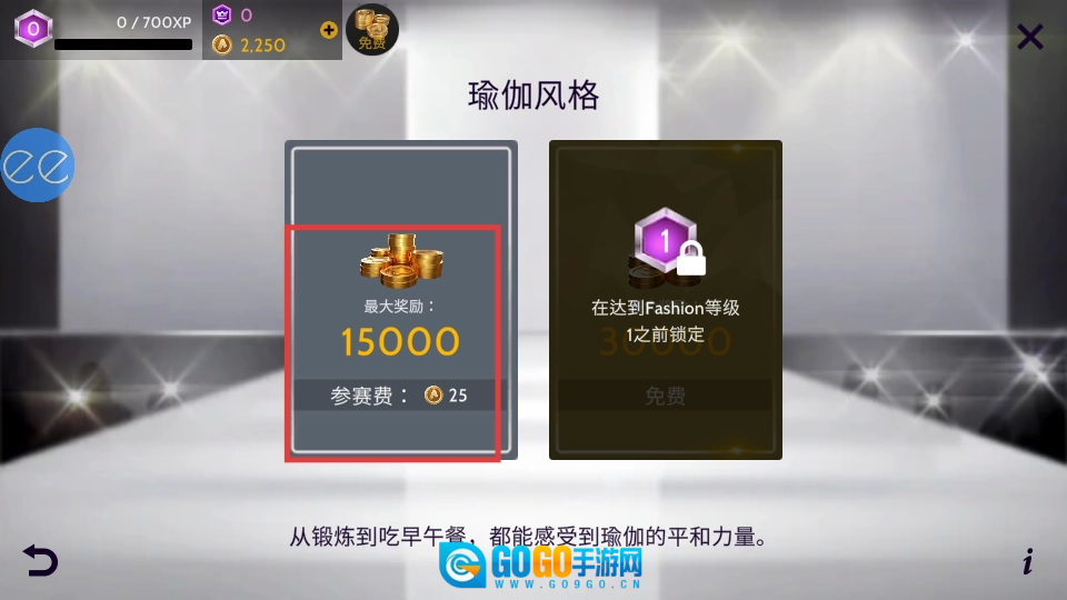 支付25金币的参赛费用,即可参与瑜伽风格主题的比赛,有机会赢取最高15000金币的丰厚奖励,同时还能助力提升个人的时尚等级。