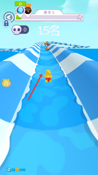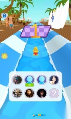 1、开启竞速:点击“开始”按钮,操控黄衣小人角色进入水滑道。