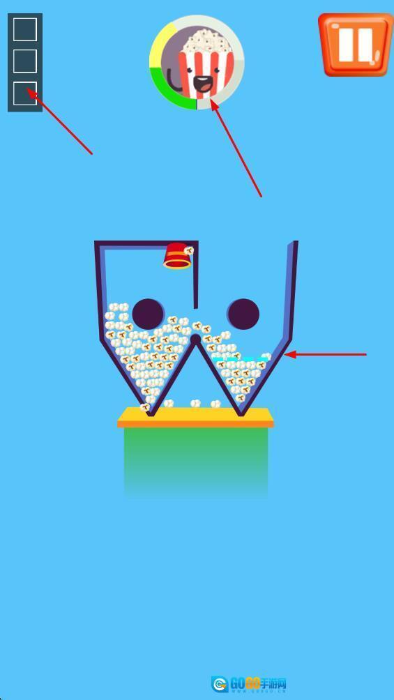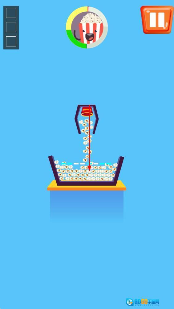1、控制爆米花从上方容器掉落,精准落入下方容器内,以此累积爆米花的数量。