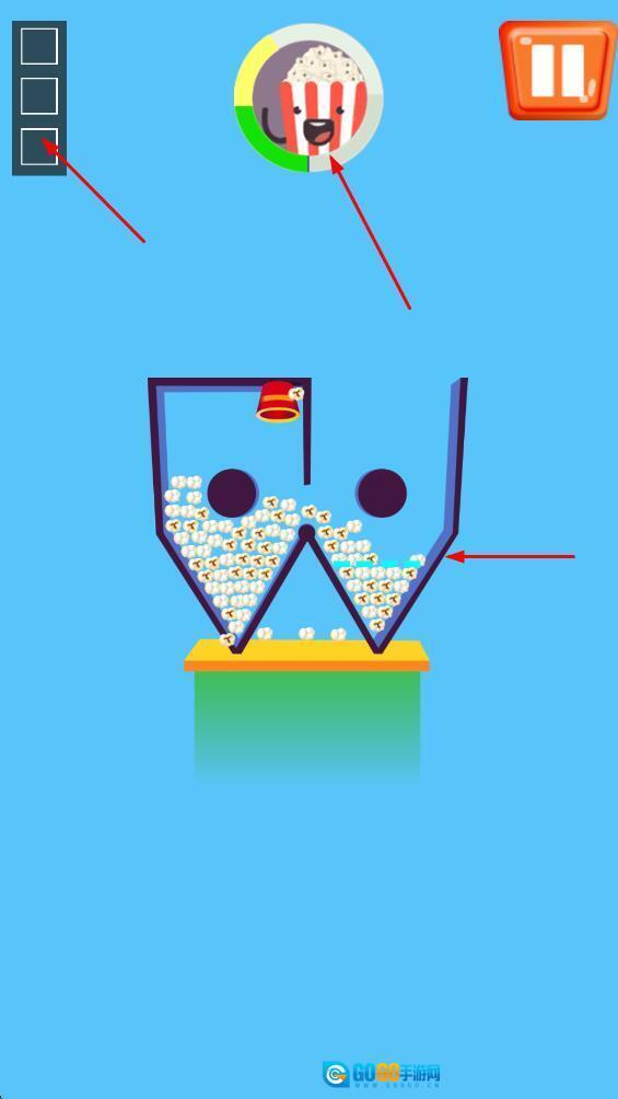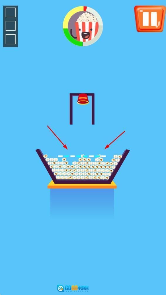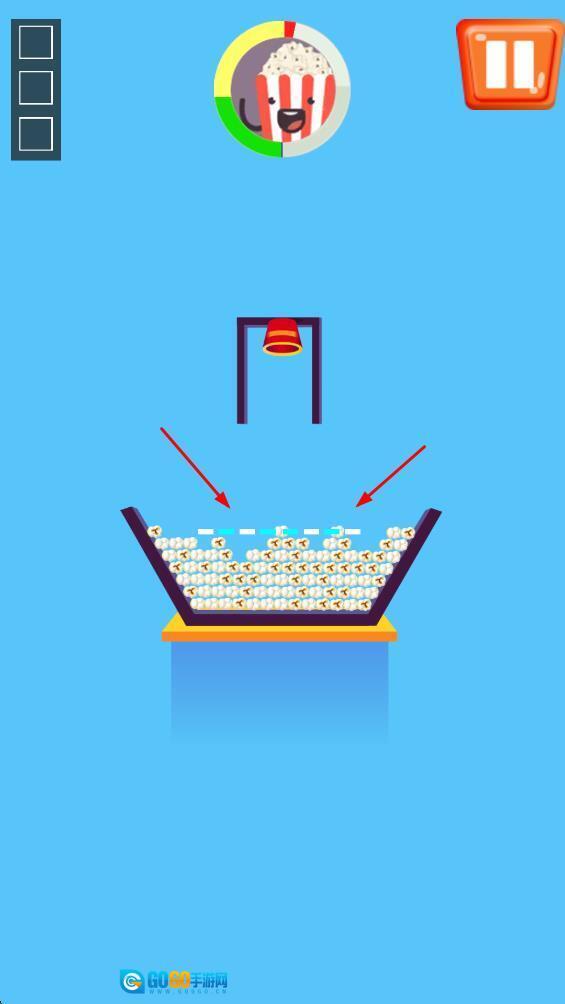 2、画面简约聚焦玩法:游戏画面并非核心亮点,仅呈现简单机关、爆米花桶与线条元素,引导玩家将注意力完全集中于引导爆米花入桶的操作上。这种简约设计能有效避免视觉干扰,让玩家的操作与思考过程更为纯粹。