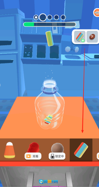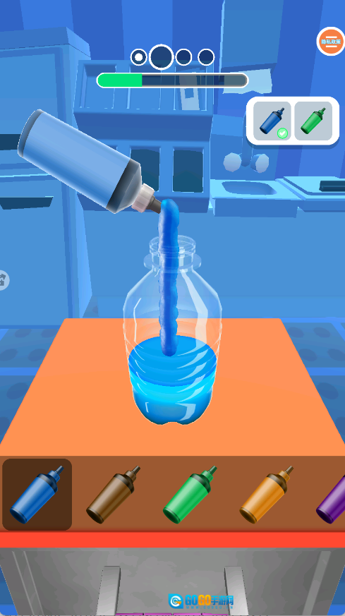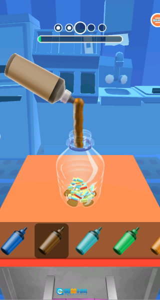2、正式开始制作后,点击那些带有色彩的液体,把它们倒进瓶子里,一直倒到瓶子被装满就可以了。