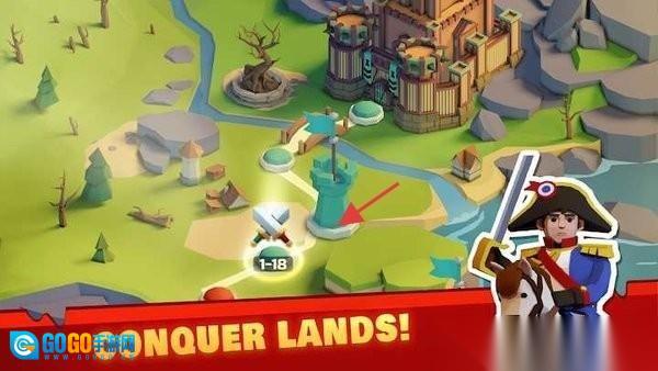 1、在大地图上选择关卡(例如1-18),点击对应建筑推进进程,执行“CONQUERLANDS!”指令,完成领土占领。