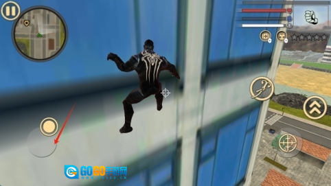 2、滑动左侧摇杆,可操控毒液攀爬建筑、移动身形,在城市里穿梭往来,前往指定的目标地点;拨动轮盘,则能移动人物。