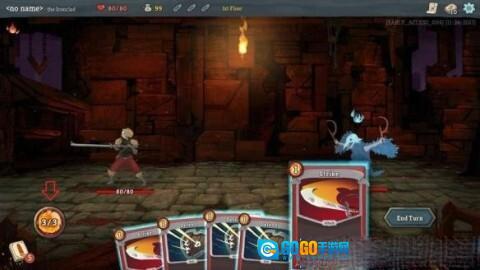 3. 当你在冒险地图上点击节点图标进入冒险,如果该节点遭遇敌人,就会开启战斗。战斗过程中,你得灵活运用卡组里的卡牌来对抗敌人。游戏初期,每回合你能够从卡组抽取5张卡牌,同时要留意左下角的能量球,它展示了你本回合的可用能量值。