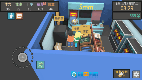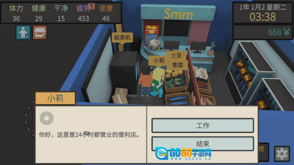 去超市做兼职(虽说赚不到钱,但看重的是工作价值),把工作时长拉到最大。之后到长椅上休息4个小时,接着去超市的贩卖机买包薯条,再继续兼职。(要自行计算好便意值和干净值,当便意值达到一百时,立刻解决;干净值为零时,就去水龙头处清洗)结束后,再在长凳上休息8个小时。