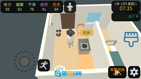 游戏开始,首先前往餐厅担任厨师,接着吃顿饭之后再继续工作。随后回到平房,通过看广告赚钱来积攒获取以下物品。当然,你也可以选择继续去当厨师(之所以要看广告还选择干厨师,是为了提升厨艺,这在后续会派上用场)