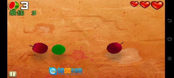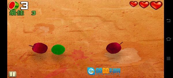 在游戏中,情况如图所示,玩家需滑动屏幕,切割从上方掉落的水果。