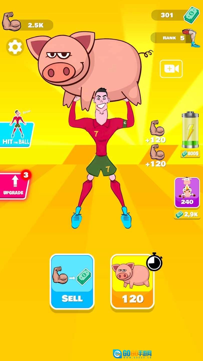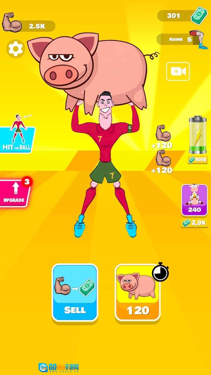 2、用手指疯狂点击屏幕,增加C罗的力量,你可以通过锻炼获得金钱,用金钱购买各种健身道具,升级强化各种物品,最终成为超级厉害的举重王。