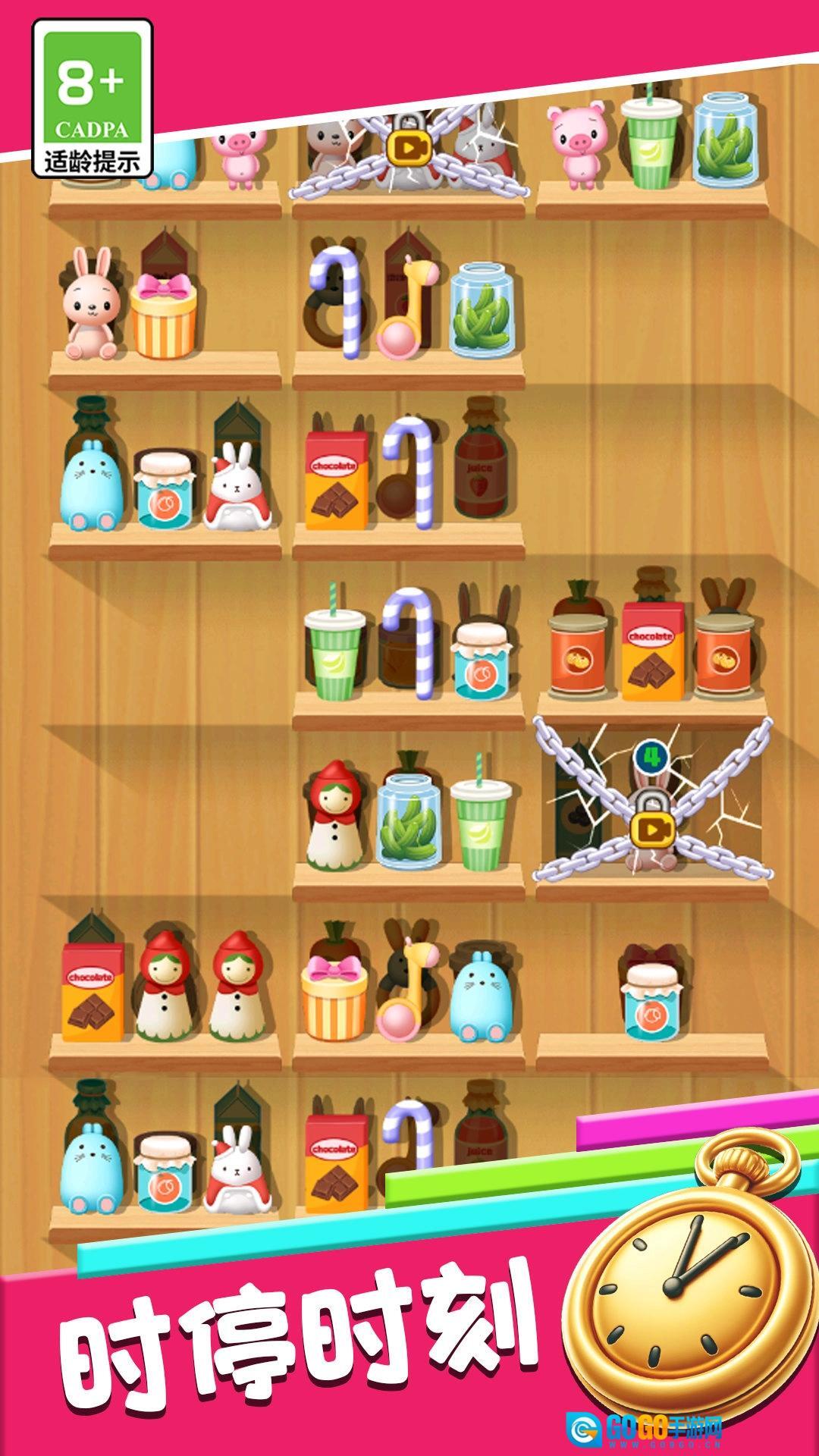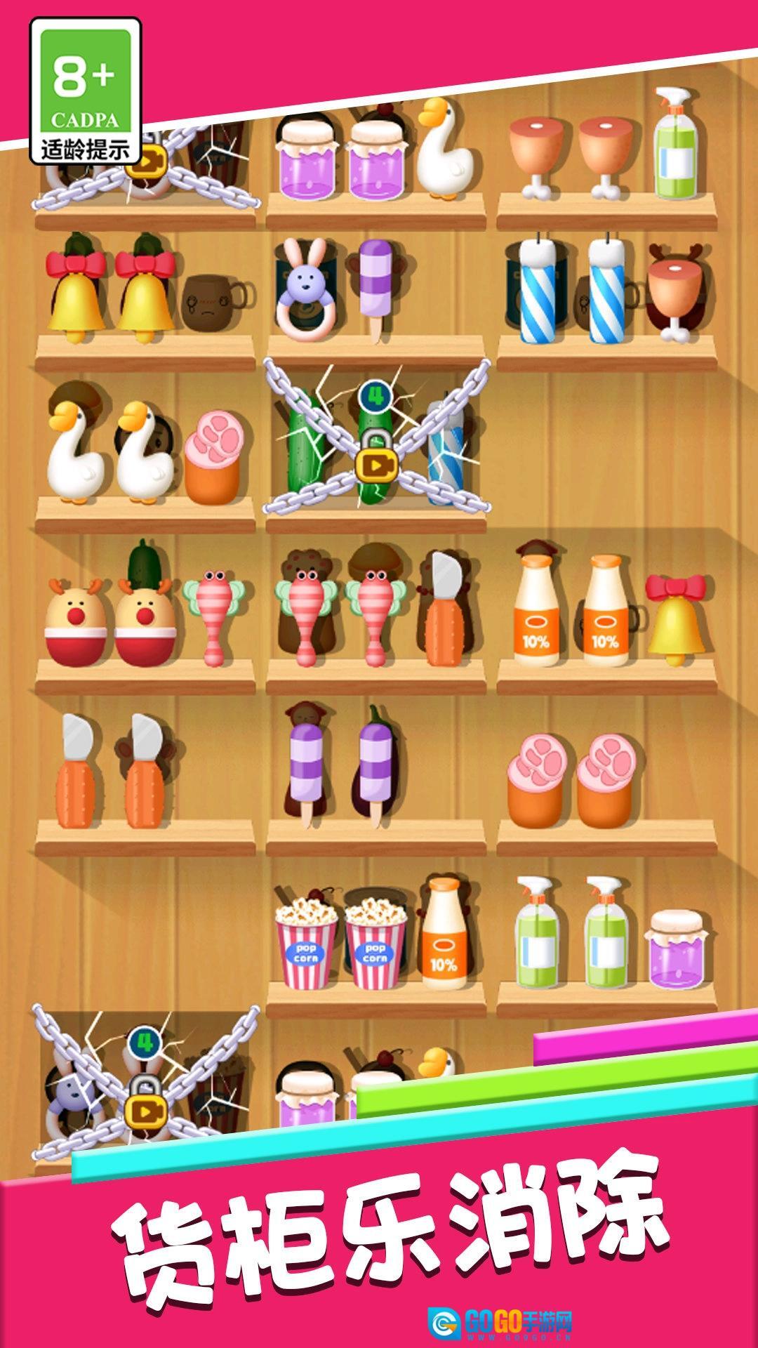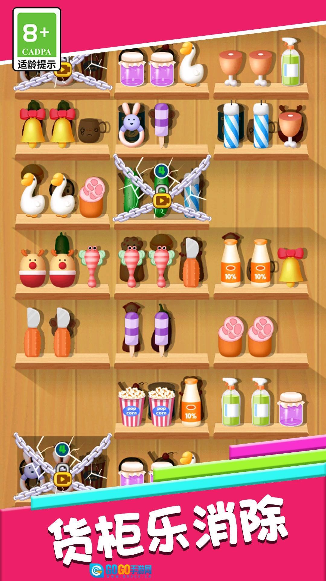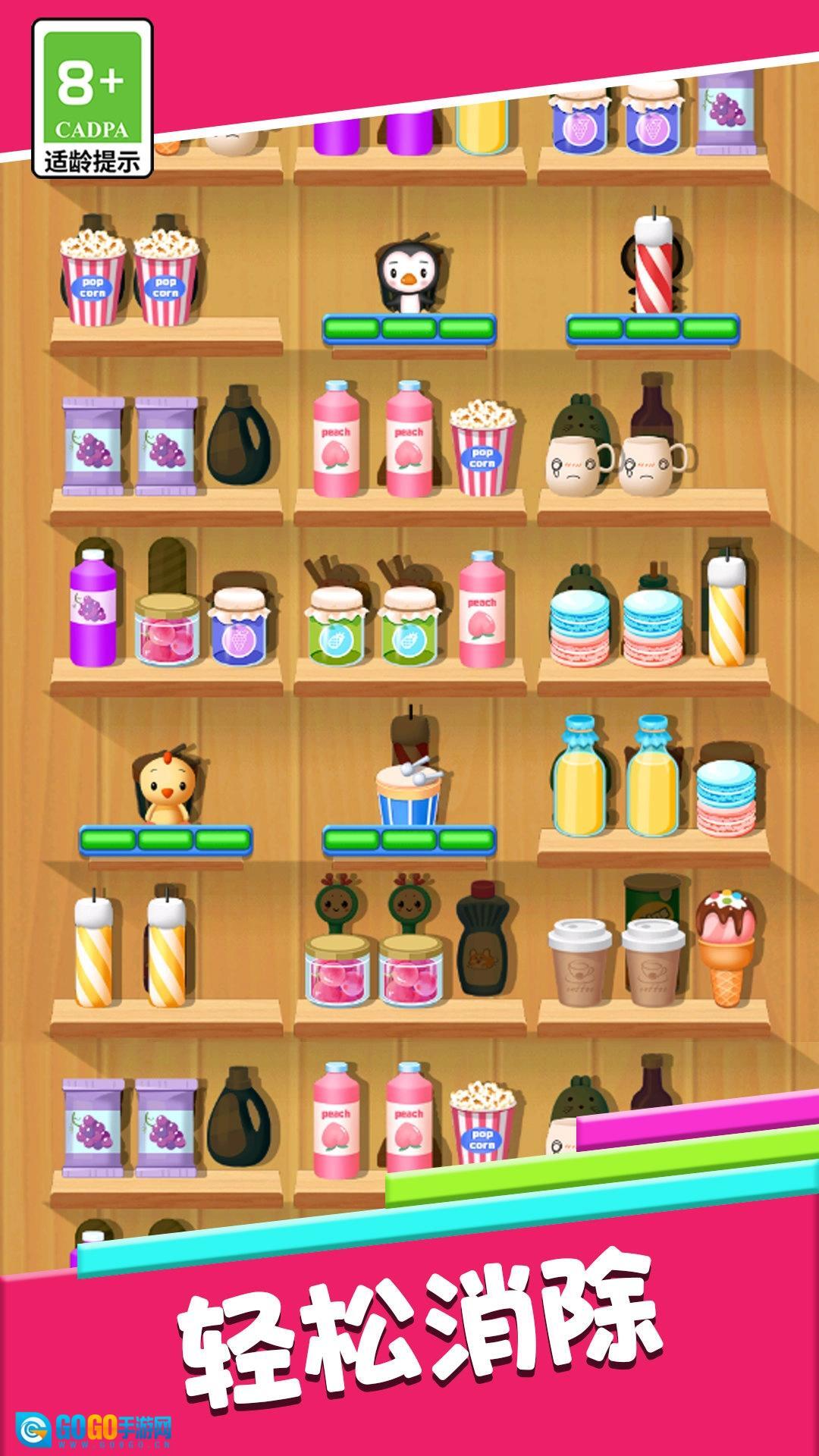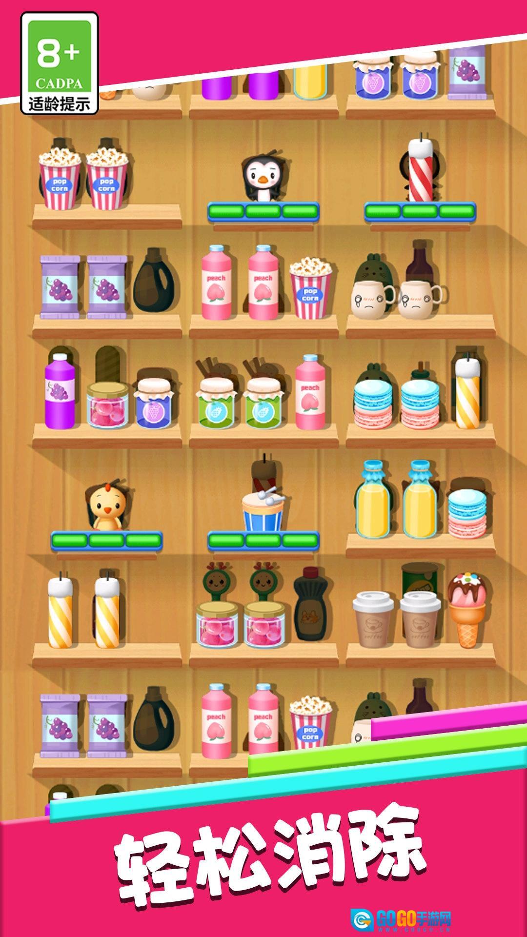 2、经过消除特定形状的货品来解锁并组合不同功用的货柜。