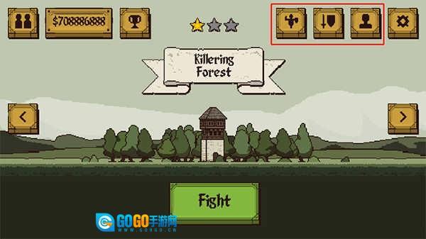 2、点击中间的“Fight”按钮就能开始游戏,界面上方从左往右分别是训练场、武器和人物选项。