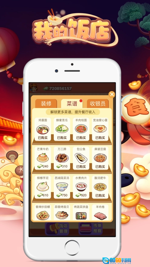 3、解锁更多高级食材与新式菜系,用金币升级餐厅设施,吸引更多顾客!