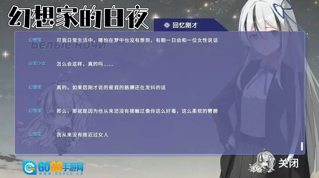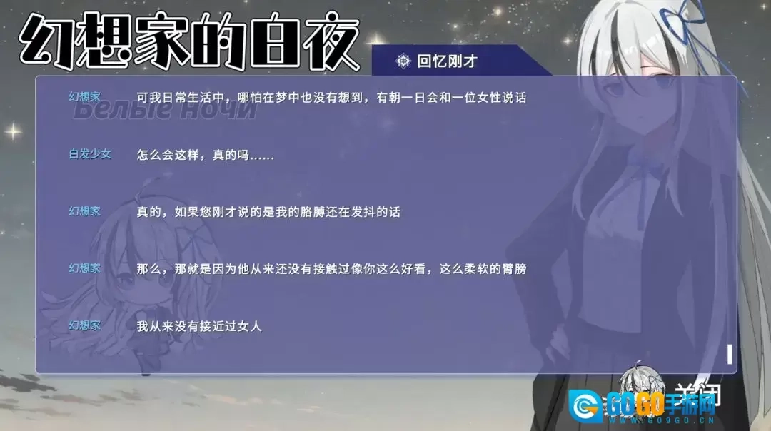 《幻想家的白夜》是一款由个人独立制作的AVG视觉小说,创作灵感源自短篇小说《白夜》。在游戏里,玩家将化身“幻想家”,在四个极具特殊性的“白夜”场景中与山奈晞邂逅,由此开启一段段充满羁绊的故事。剧情推进至关键节点时,玩家需要从多个选项中做出选择——不同的抉择会导向各异的结局,这也让游戏支持多周目体验,不妨来尝试一下吧!