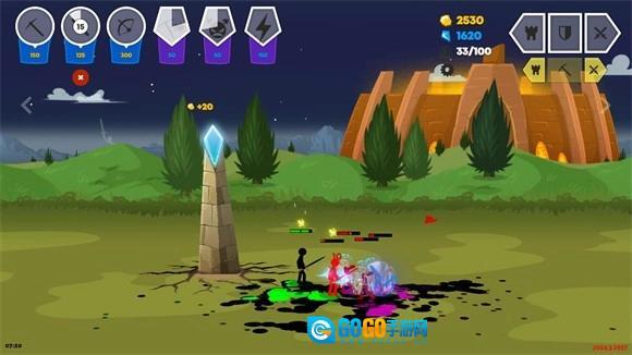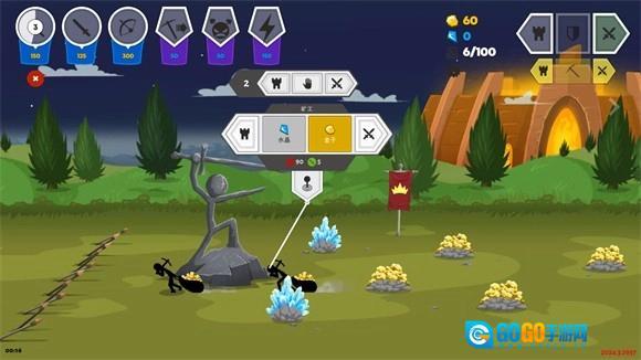对战中的资源得靠矿工采集,点击矿工就能给他们分配采集黄金或水晶的任务。