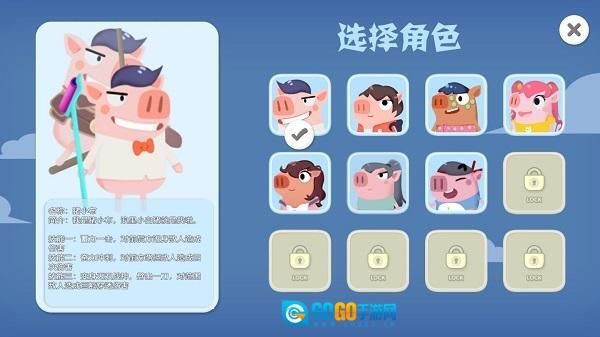 在游戏里,玩家能够挑选的角色总计8位,具体为:猪貂蝉、猪小布、猪小贤、猪一菲、猪益达、猪大力、猪咖喱、猪关谷。而关于角色的激活途径,想必会是游戏币和氪金这两种模式。