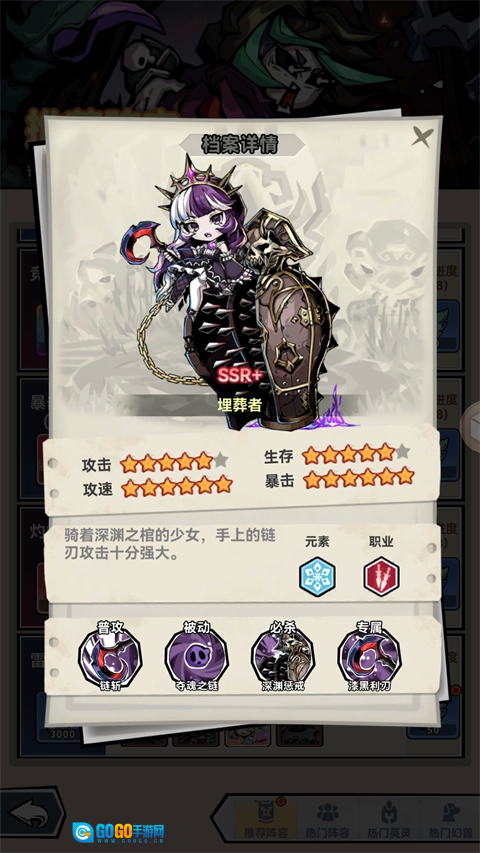 属于刺客,使用黑暗元素伤害,对后排敌人进行收割。