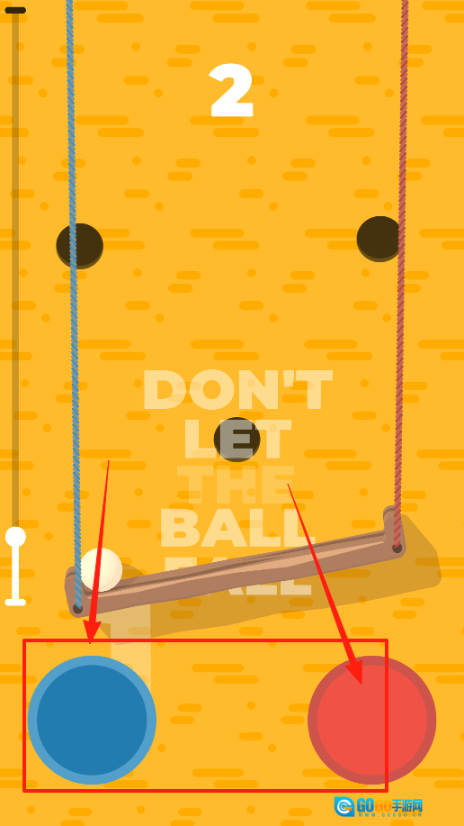 进入第二关后,木板上小球的初始位置发生了变化,下方新增了蓝色和红色的大圆按钮。当小球开始滚动时,需要根据它的移动方向,迅速点击对应颜色的按钮,使木板产生倾斜,从而让小球保持在木板上,避免掉落。