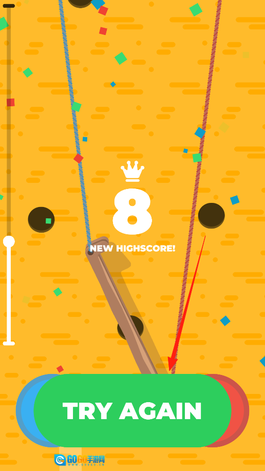 3. 这是游戏结束界面,会显示最终得分和“TRY AGAIN”按钮。当小球掉落时游戏就会结束,若想重新挑战更高分数、看看这次能否让小球坚持更久,点击绿色按钮即可重新开始游戏。