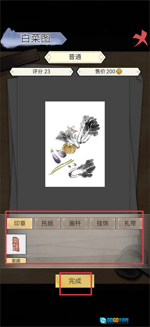 4、画作完成后,需进行装裱工序,按顺序选好托纸、画杆、印章等材料与配件,点击完成即可。
