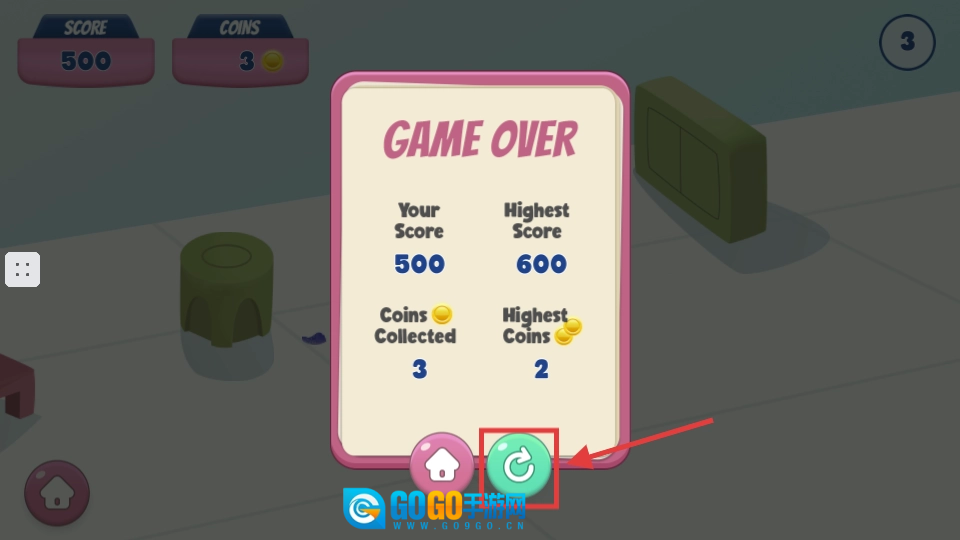 游戏结束后,点击那个带有循环箭头的绿色按钮,重新发起挑战,这样就能提升分数和收集更多金币了。