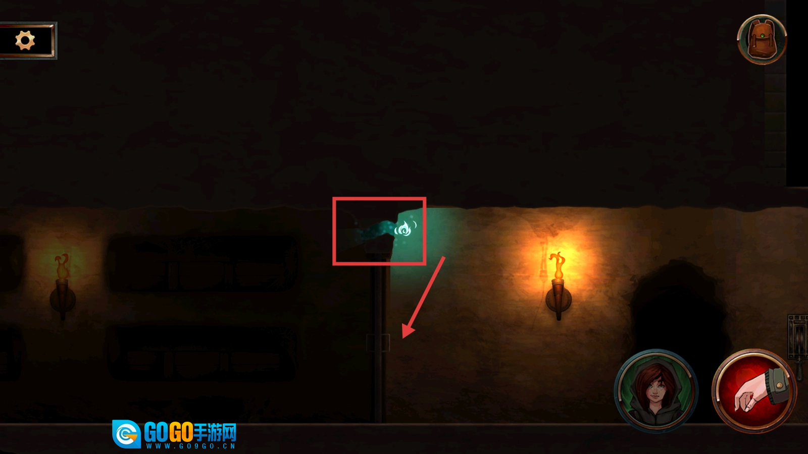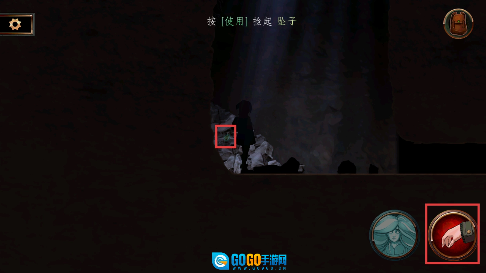 在洞穴场景,看到提示【按使用捡起坠子】,点击右下角红色手掌按钮,拾取发光坠子。