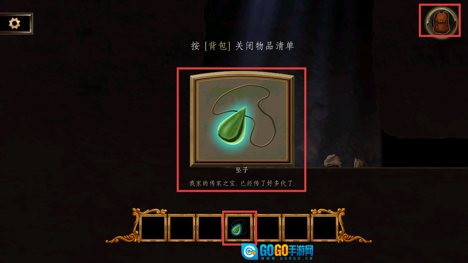 打开背包,查看刚捡起的【坠子】,了解其是传家之宝,按提示再点背包按钮关闭物品清单。