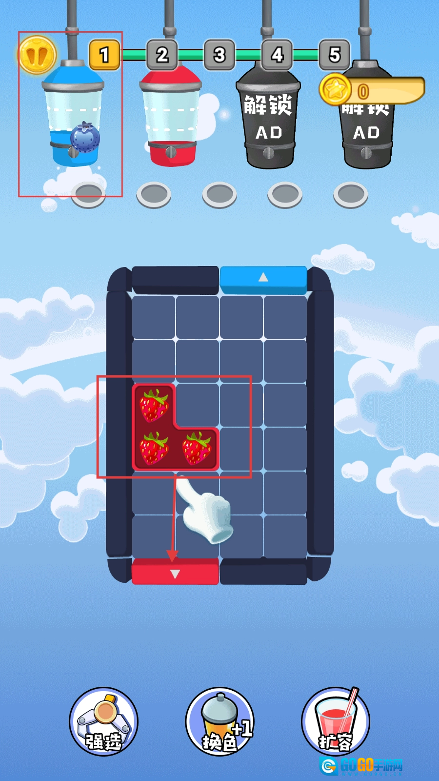 继续匹配颜色,拖动草莓到红色边框,填满完成榨汁流程。