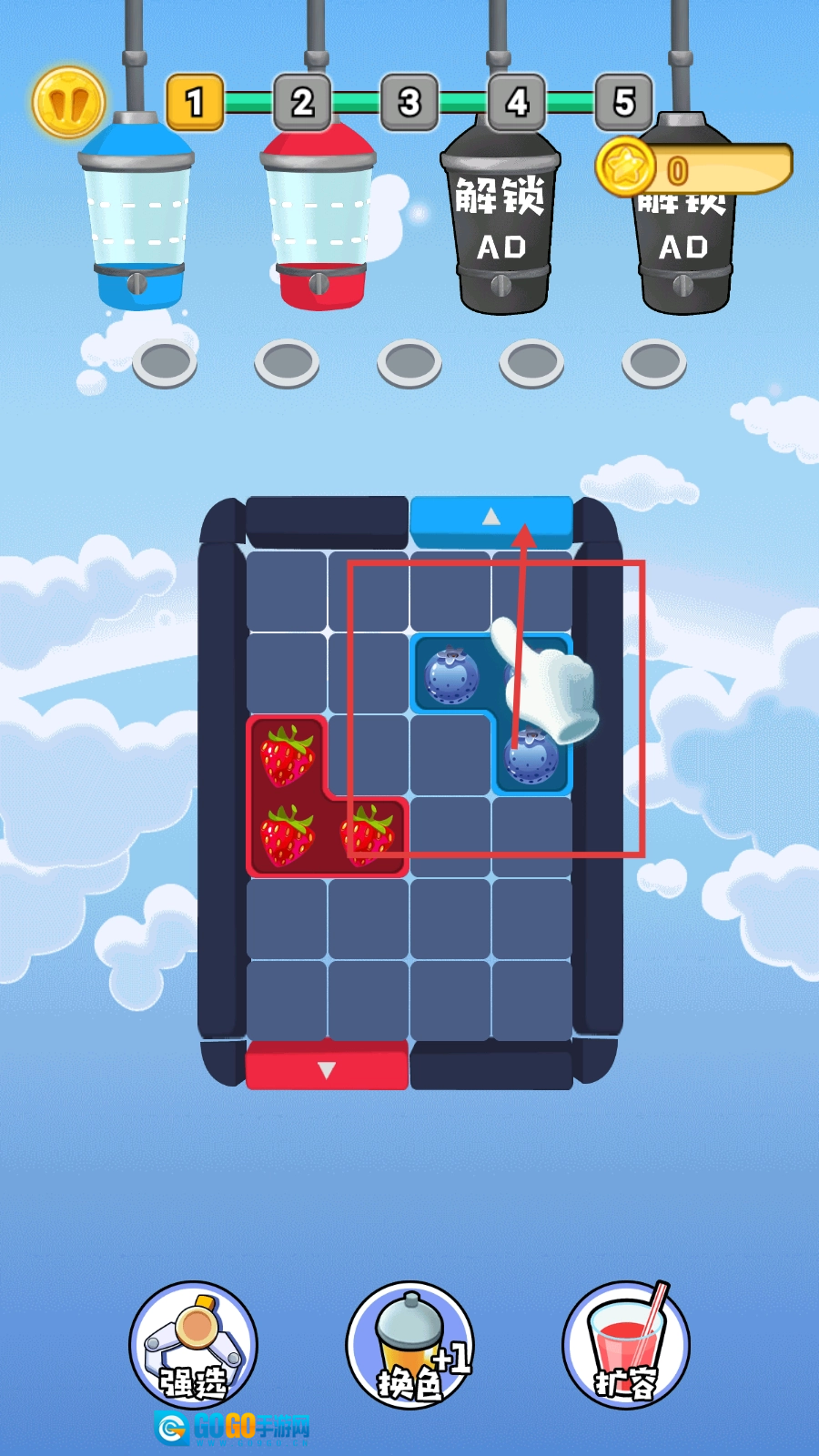 障碍优先处理:先识别并移动阻挡关键路径的水果,优先清理榨汁机周围的障碍物,为后续水果移动开辟通道,避免陷入移动僵局。