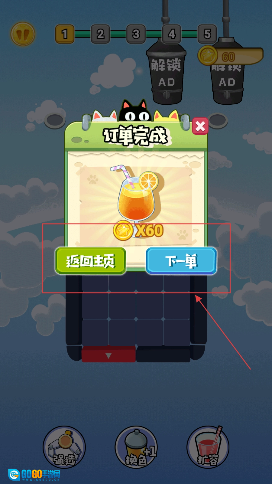 订单完成后,选【下一单】接着玩或【返回主页】重开。