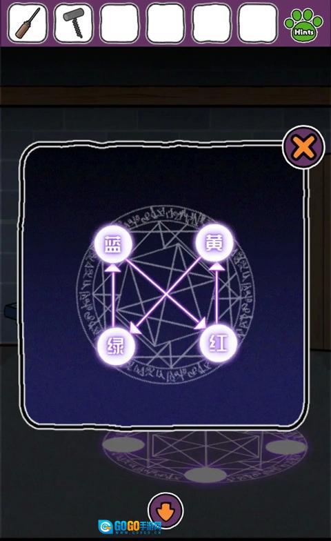 记住花瓶上的颜色分布,向右查看魔法阵,根据之前提示的从蓝到蓝,得出密码左上下右左。