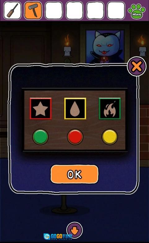 前往最初的房间,查看两侧石雕底部柱子获得提示,返回有吸血鬼画像的房间,点击画像下密码箱,用墨水对相应的位置进行染色。