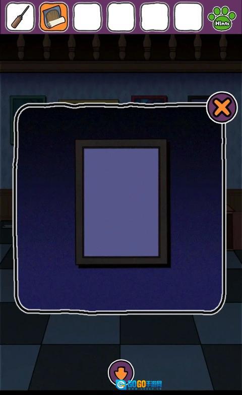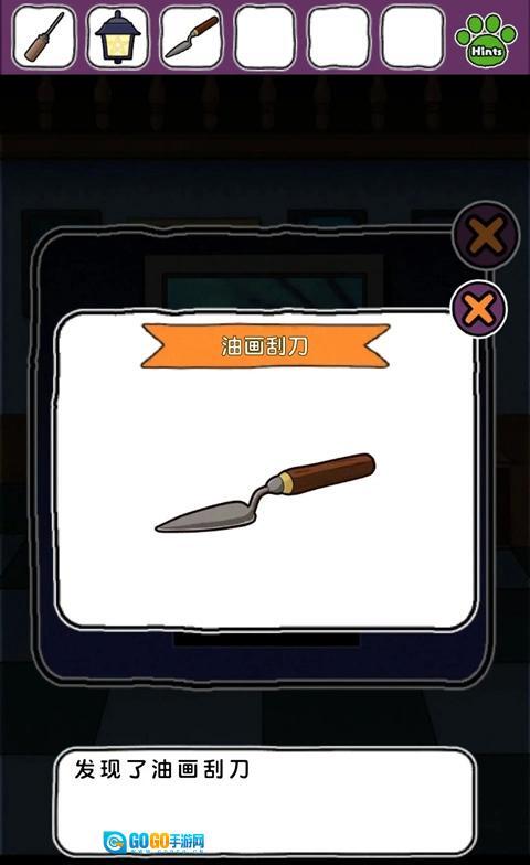返回最初的房间,用螺丝刀把左侧的灯卸下来,向右到达有红色沙发的房间,点击第一幅画,用螺丝刀卸下铭牌,获得刮刀。