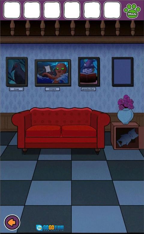 向右到有红色沙发的房间,用钥匙打开花瓶下的柜子获得石像。