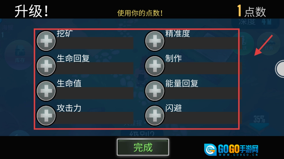 升级时,根据玩法,选属性,点“+”,再点“完成”。