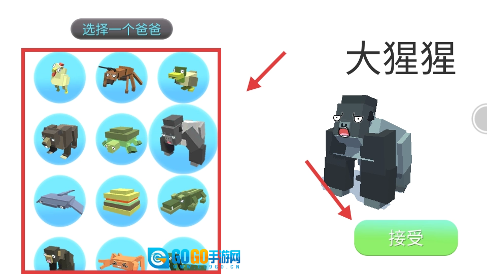 选喜欢的动物当“爸爸”,比如大猩猩,点“接受”合成新动物。