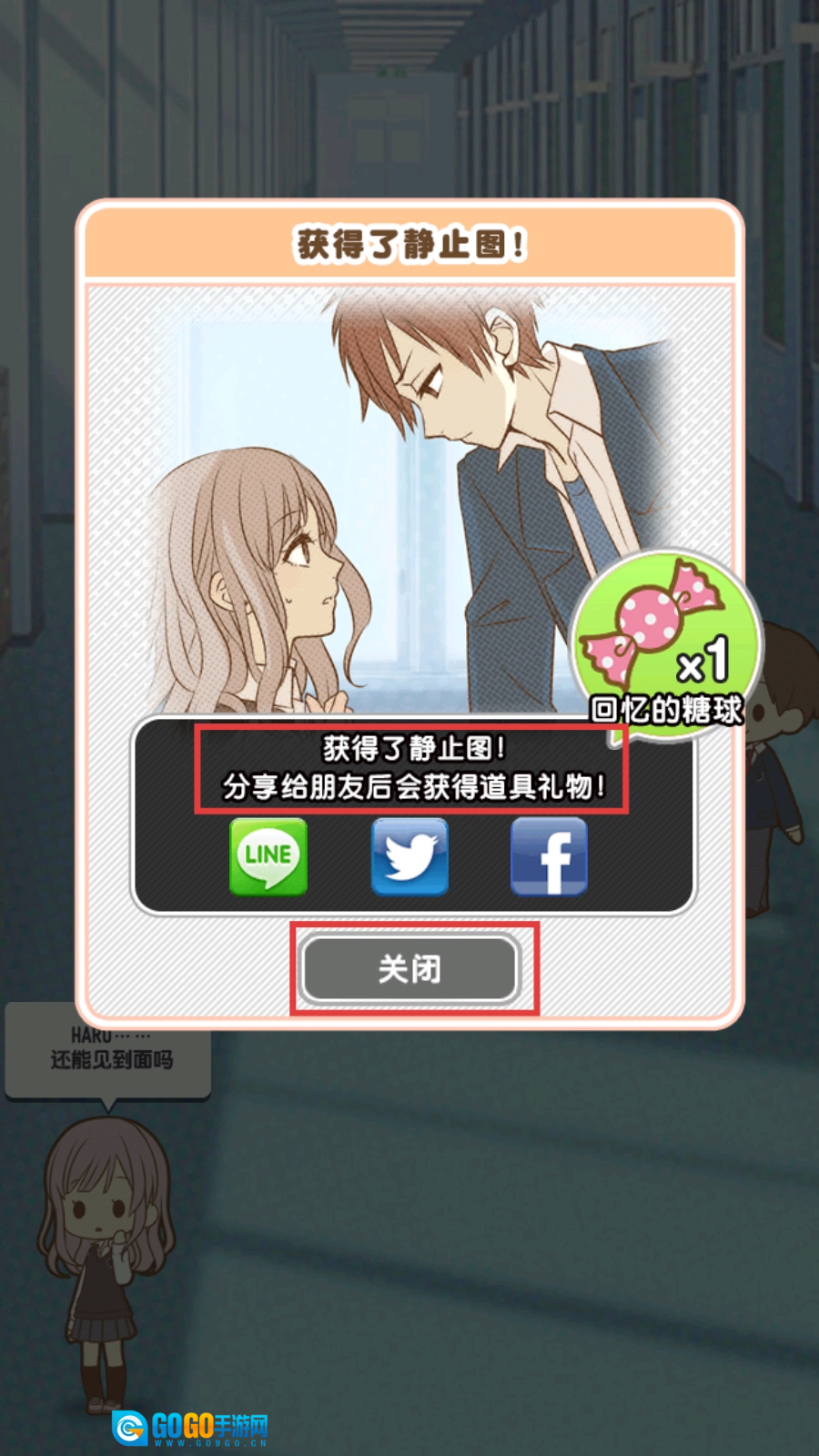 获得静止图后,可分享至社交平台领道具,点击【关闭】,继续剧情探索之旅。