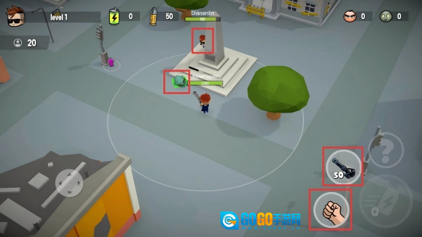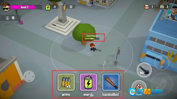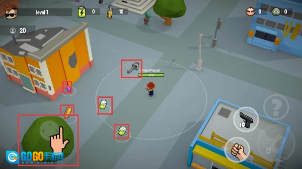 在关卡场景中,滑动左侧摇杆移动角色,拾取武器、道具,为对抗僵尸做准备。
