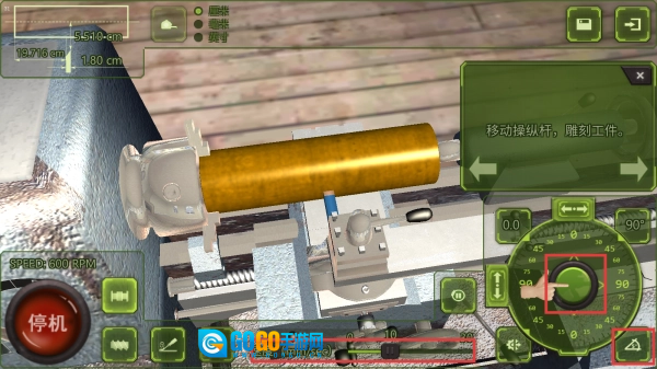 加工时,转动右侧操纵杆让机器推进运作,拖动【速度】滑块可以调节速度,配合角度等按钮,精准雕刻工件吧。