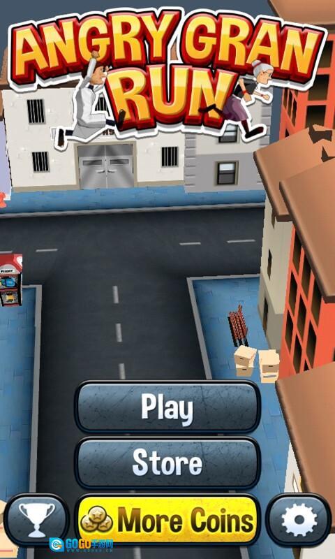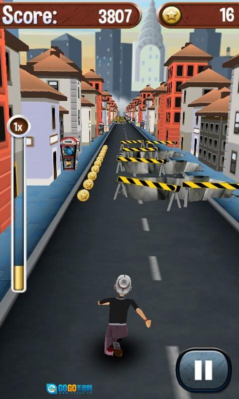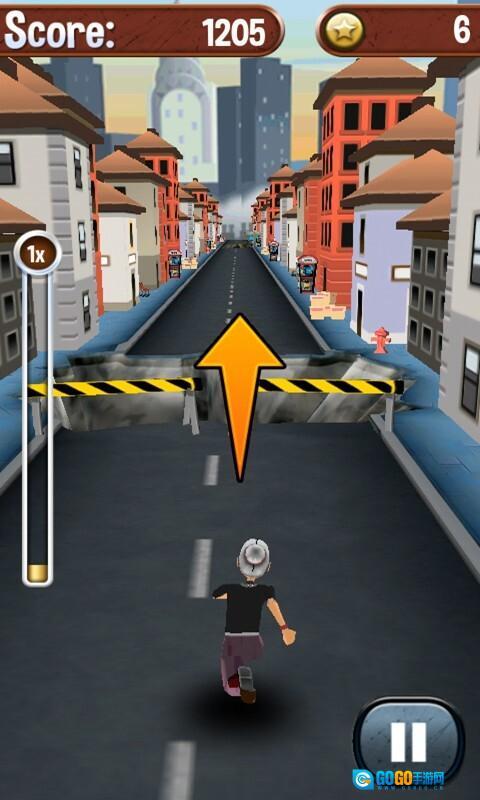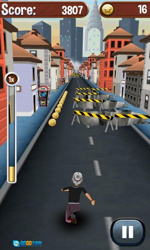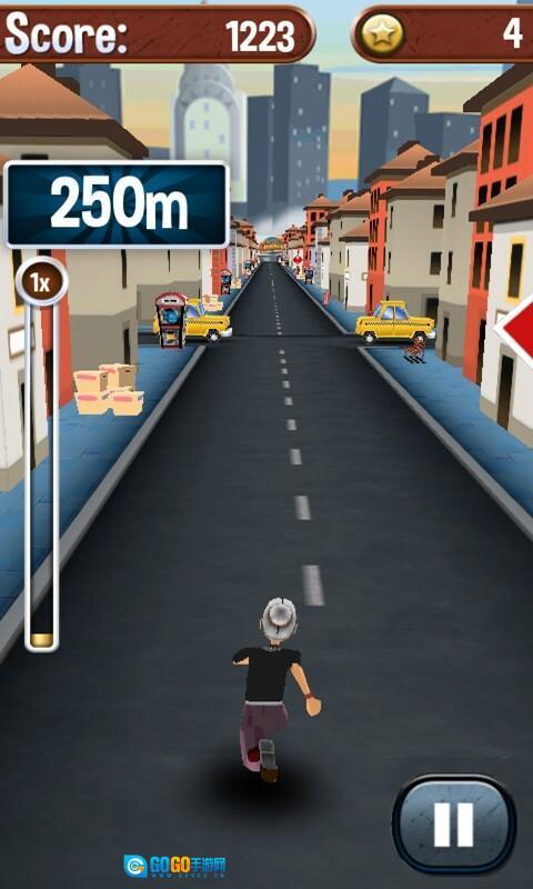 2、游戏里,玩家可通过摇动手机和触屏操作,控制老奶奶向前狂奔、跳跃或是拐弯;