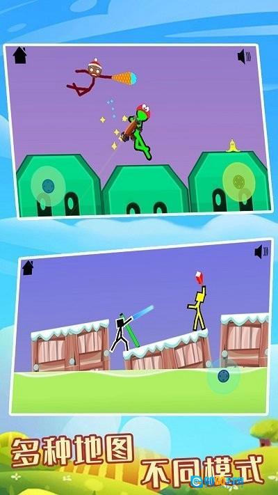 3、采用与众不同的Q版形象,在火柴人互殴的同时,动作技艺和场景设计也赋予了游戏精彩的视觉效果。