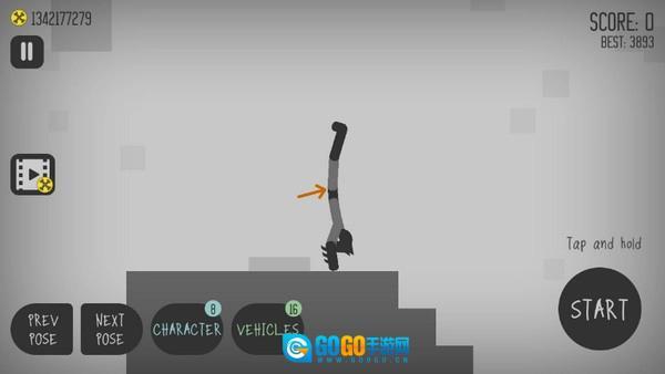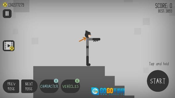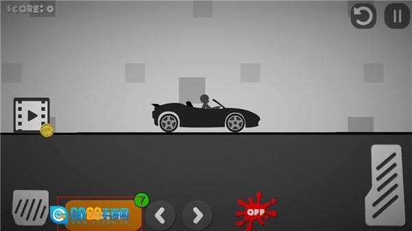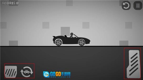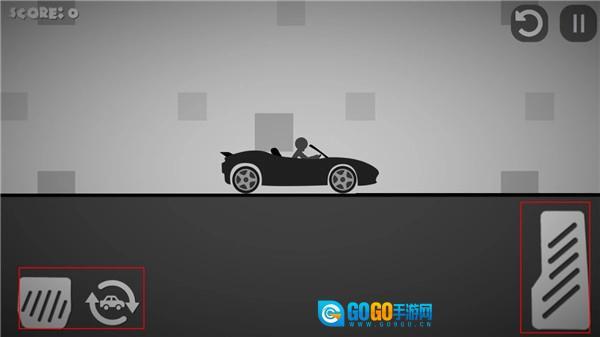 3、活用按钮,左边的按钮是让车减速或者后退的,右边长条的按钮是加速前进的,而有汽车标志的是让车重新从空中落下的,反复使用这三个按钮可以让火柴人受伤更多: