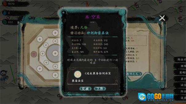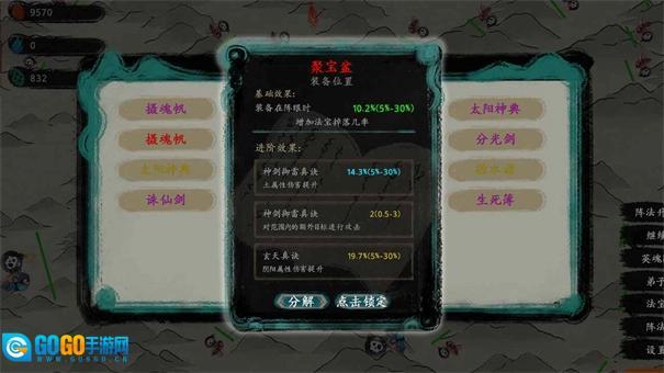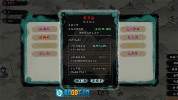 1.法宝分为弟子法宝和阵眼法宝两类。阵眼法宝前期作用不大,因为属性只能用10%,要用轮回点升级。这里主要讲弟子法宝,法宝品阶不重要,重要的是词条属性。例如:加最终伤害、暴击率、玄天真决攻击距离、神剑御雷攻击数量等。