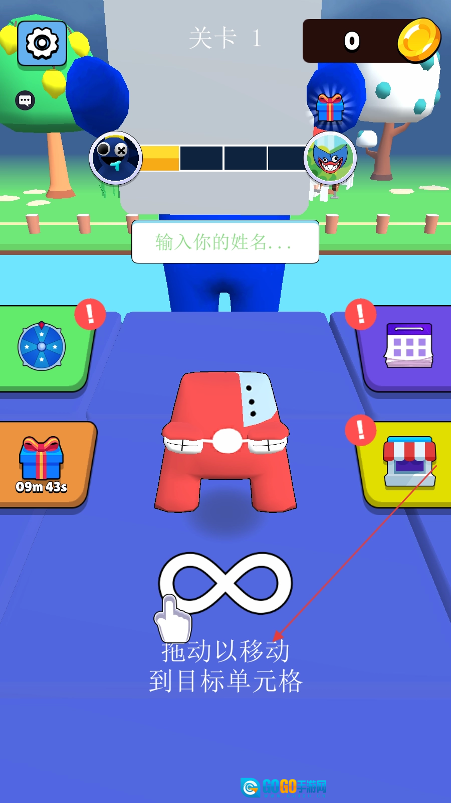 查看怪物拿起的方格,拖动角色到目标方格,不要让角色掉落。