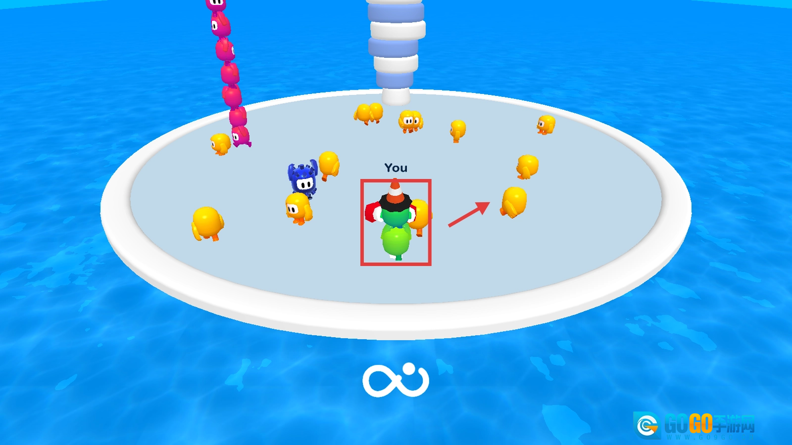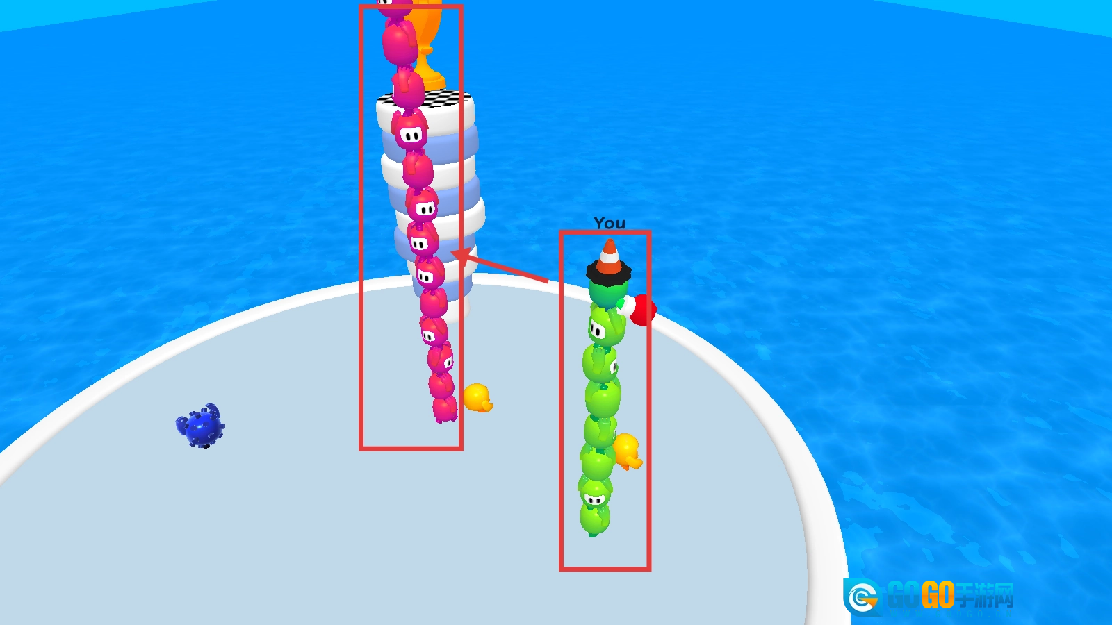 遇到粉色长条对手,找机会用身体去碰撞,破坏它的叠叠乐,阻碍其成长。