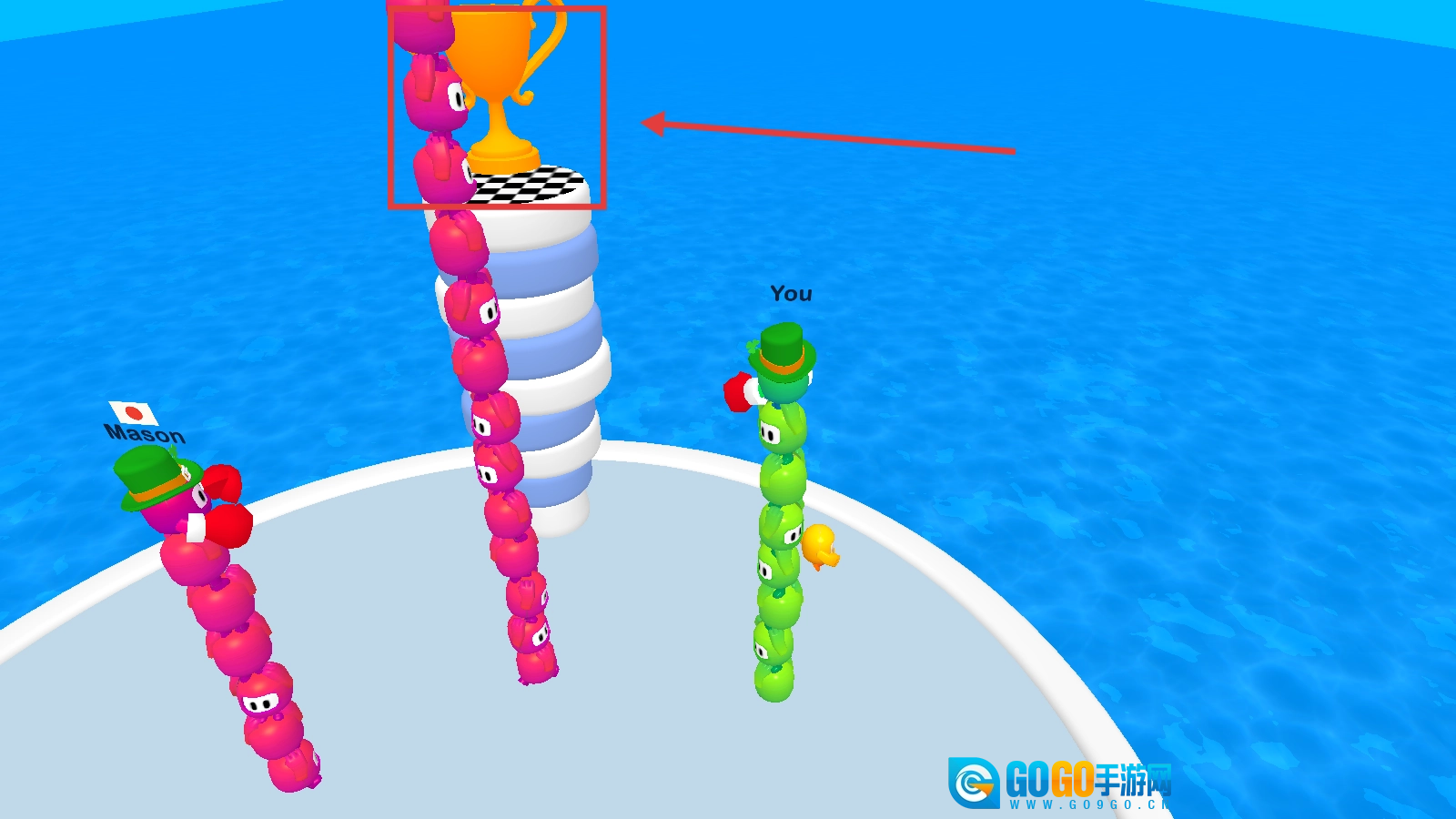 朝着有奖杯的高台前进,尽量抢先到达,占据有利位置,夺得先机争取胜利。
