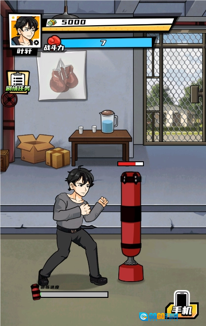 进入拳馆,通过点击屏幕攻击沙袋来提升战力,沙袋后期会越来越难。