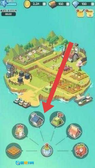 3、进入岛屿界面后,点击箭头所指的建筑图标,即可建设房屋、工坊等新设施,以此丰富农场的经营项目。