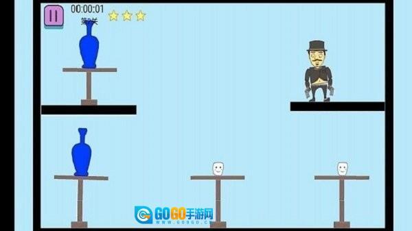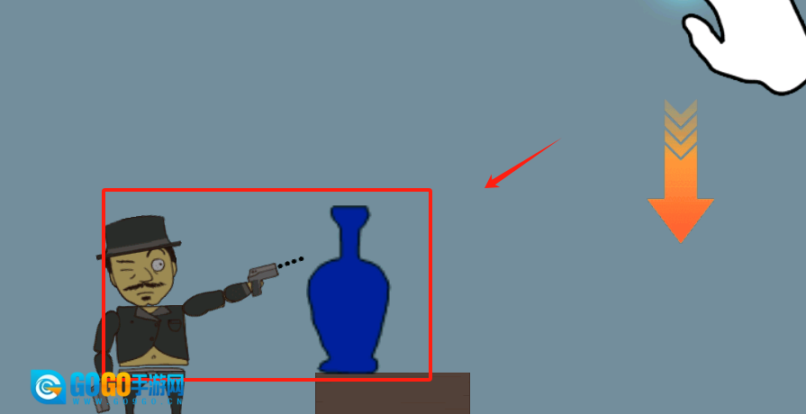 3、独眼黑衣角色举枪对准花瓶,上下箭头提示可调整射击角度或切换目标。