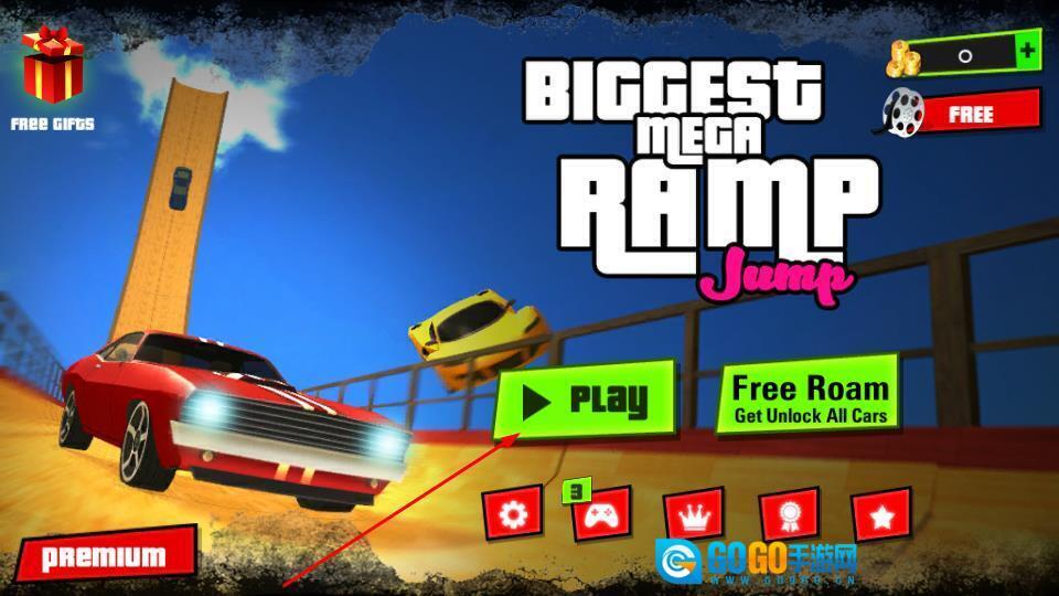 1、进入主界面后,点击绿色的Play按钮,即可开启赛车特技挑战,开启刺激的巨型坡道冒险之旅。