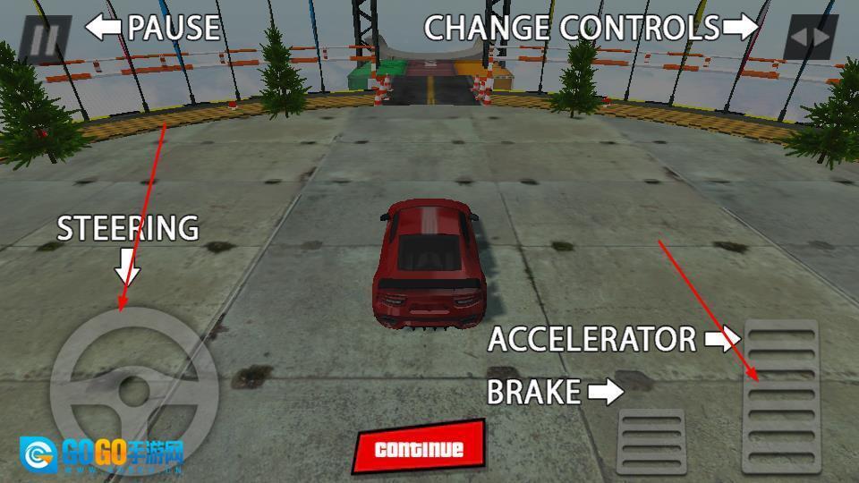 2、进入操作设置界面后,先熟悉STEERING方向盘的方向控制、ACCELERATOR油门的加速功能以及BRAKE刹车的减速功能,随后点击continue即可进入赛道。